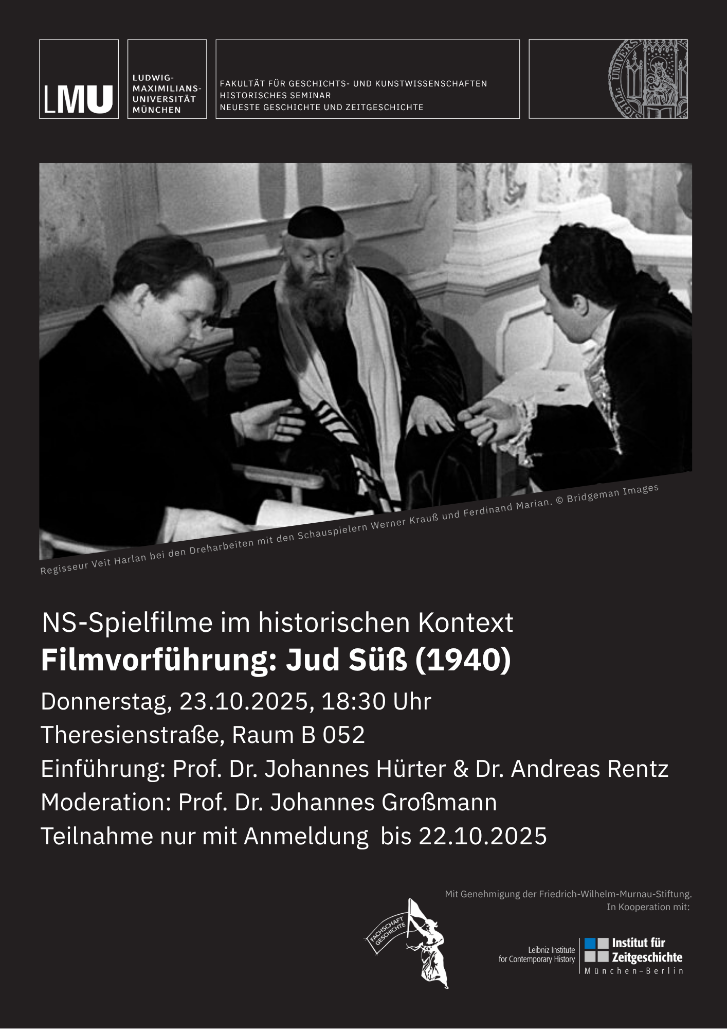 In diesem Rahmen werden wir uns nach einer Einführung von Prof. Dr. Johannes Hürter (IfZ) und Dr. Andreas Rentz (IfZ, ZfHS) gemeinsam den NS-Vorbehaltsfilm "Jud Süß" ansehen. Im Anschluss leitet Prof. Dr. Johannes Großmann (LMU, Zeitgeschichte) eine kritisch-reflektierende Diskussionsrunde über den Film. Die Veranstaltung findet am Donnerstag, den 23.10.2025, um 18:30 Uhr in der Theresienstraße 37-39 (Mathebau) im Hörsaal B052 statt.